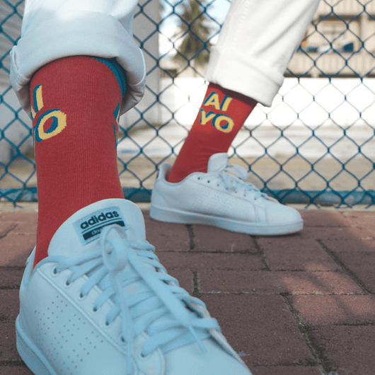 One of our best sellers! Can’t control your frustration any longer? Let loose with the new AIYO sock. The red background meets yellow and blue 3D letters giving the style a positive and old-school feeling. Crafted from combed cotton and pre-washed for colour retention and extra love